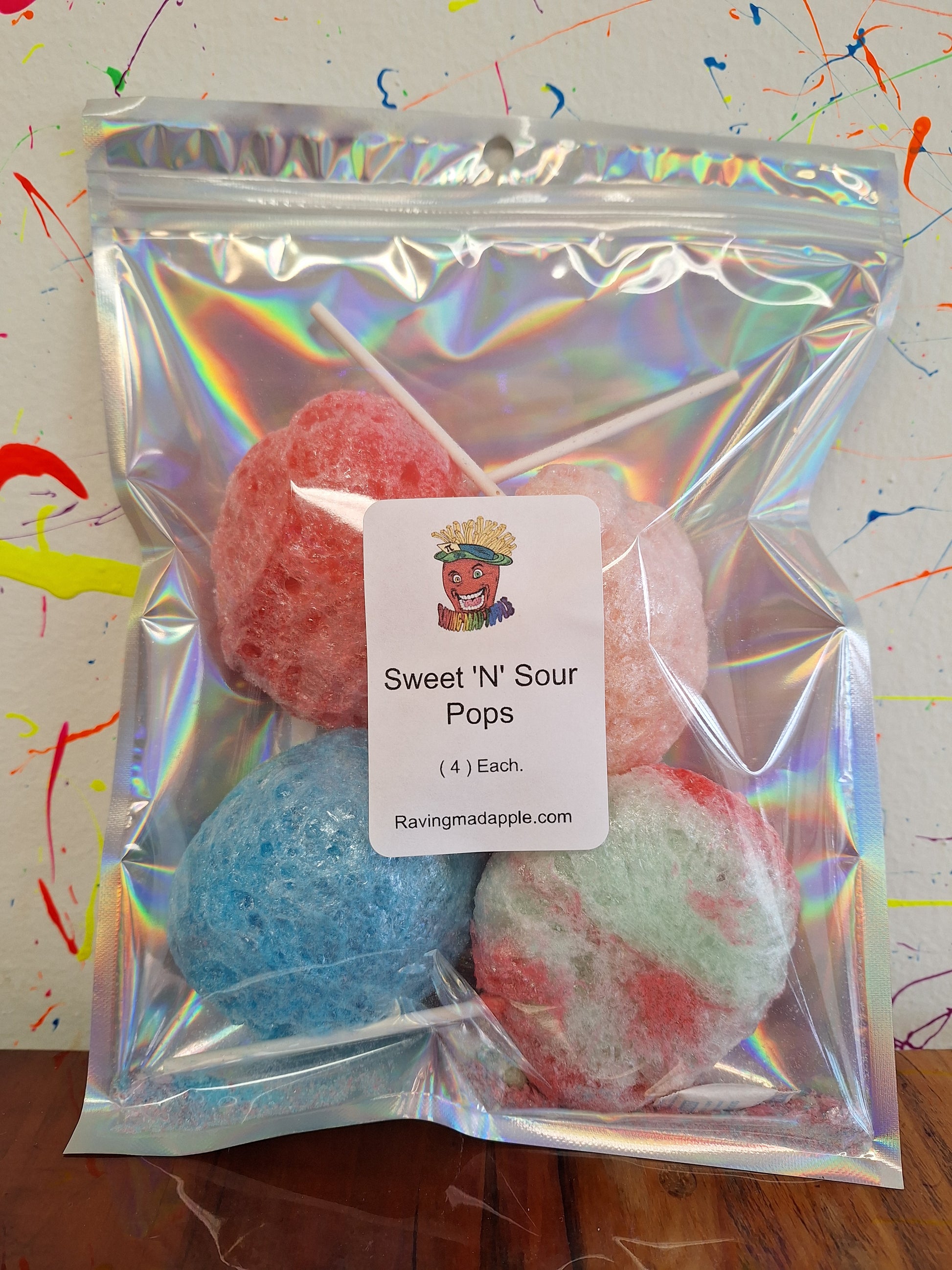 Get ready for a bold flavor adventure with SWEET " N " SOUR POPS !!! These delicious lollipops deliver the perfect balance of mouth watering combination that starts with a burst of sweet fruitiness before transforming into a tantalizing sour kick . With a variety of fun and fruity flavors. these freeze dried treats are perfect for sharing when you want s sweet n sour treat.